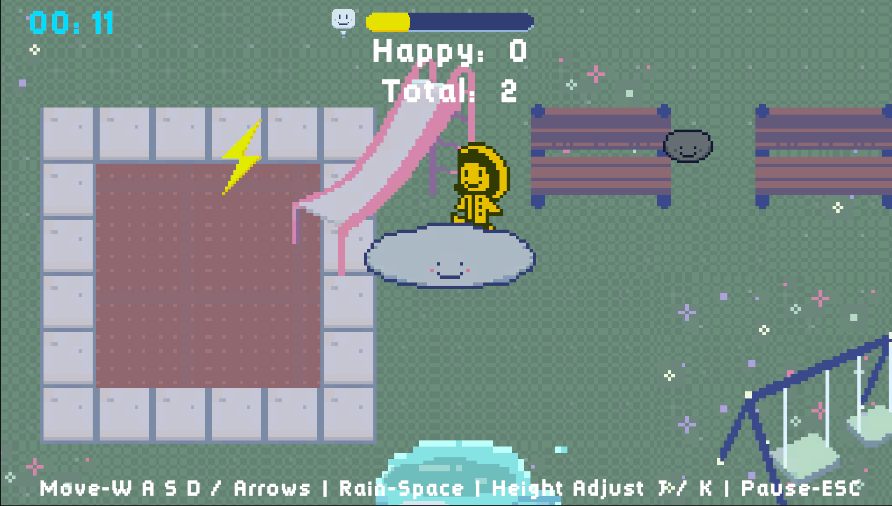 Theme: Puddle. The player controls a cloud to rain and create puddles, making children happy while avoiding raining directly on them.